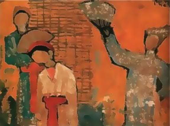 The buffoon is a familiar character in cheo, in which there is often a blend of the tragic and the comic. He speaks the language of the people and shoots shafts of satire at evil-doers, such as ignorant witchdoctors, greedy landlords, or arrogant mandarins. He may wear a short coat, the garment of the commoner or a long robe, an article of clothing favoured by members of the upper classes in the old society. A couple of buffoons may appear on stage, including the master in a flowing gown and his servant in a short coat and carrying a stick, each speaking the language and behaving the ways of his class. The buffoon may make his entry right at the beginning of a play, carrying a torch or a megaphone and provoking wild laughter from the audience.